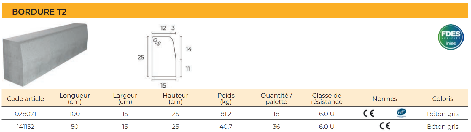 La bordure T2 est utilisé pour la réalisation de trottoir d’une hauteur de 25 cm.