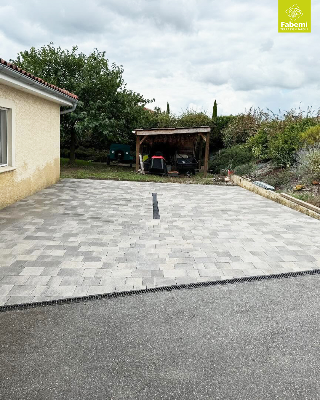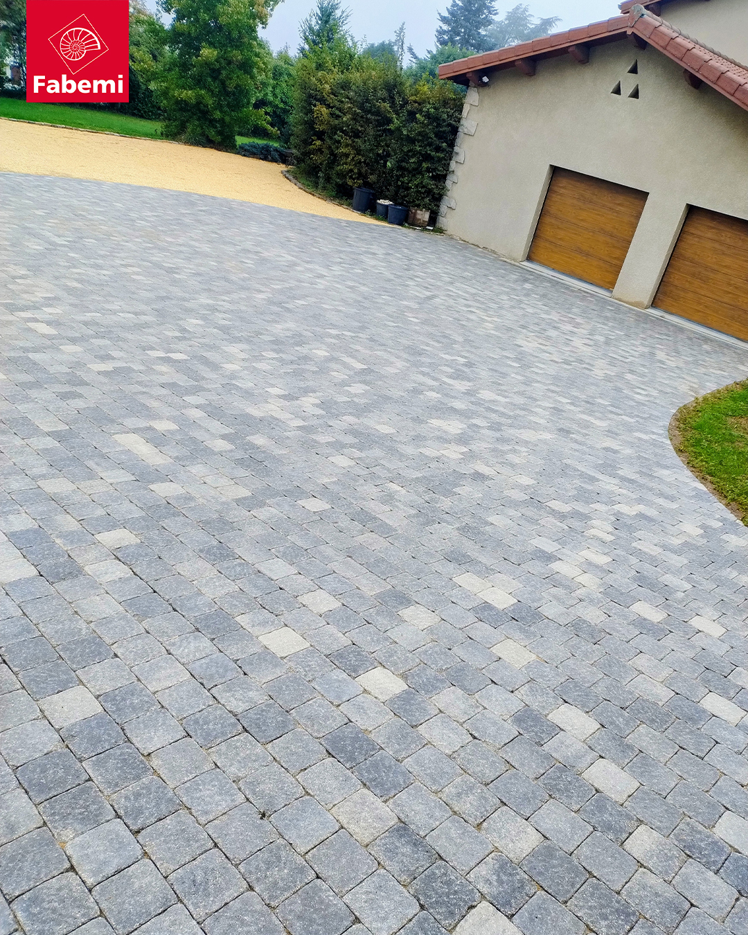 Un nouvel aménagement extérieur à BOU : qui met en valeur notre pavé TEPIA FABEMI en teintes Gris nuancé et Anthracite !