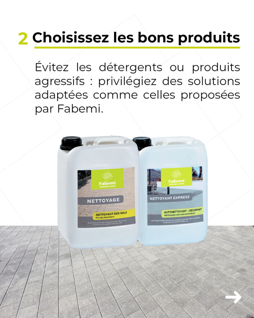 - Ensuite, choisissez des produits adaptés. Les détergents, acides, sels de déverglaçage ou solutions contenant du sulfate de fer sont à proscrire : ils abîment vos revêtements de façon irréversible. Préférez des solutions conçues pour préserver vos sols, comme celles que nous proposons chez Fabemi.