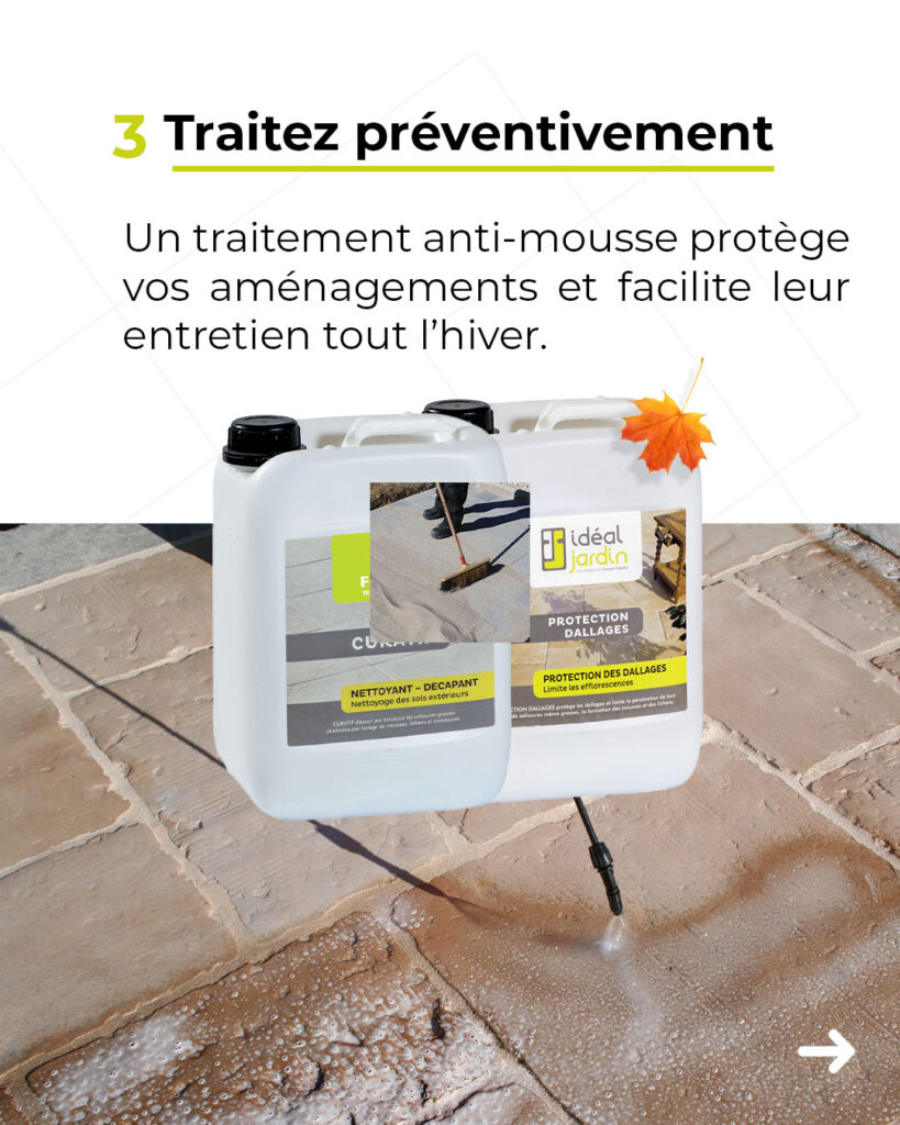 - Enfin, pensez au traitement préventif anti-mousse. Il protège vos aménagements tout au long de l’hiver et rend leur entretien beaucoup plus facile.